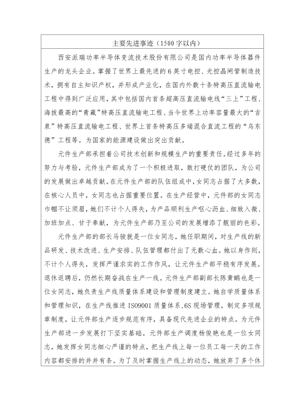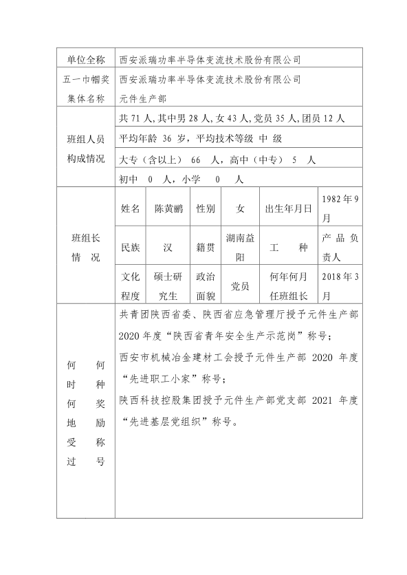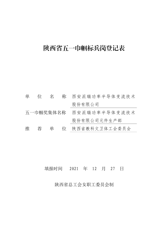 根据陕西省教科文卫体工会委员会《关于申报推荐2022年陕西省先进女职工集体和个人活动的通知》,集团公司工会拟推荐陕西省机械研究院高源,西安派瑞功率半导体变流技术股份有限公司元件生产部进行参评,现将相关材料予以公示。