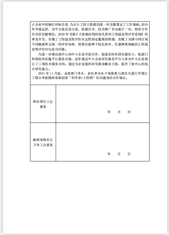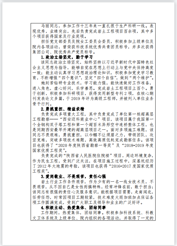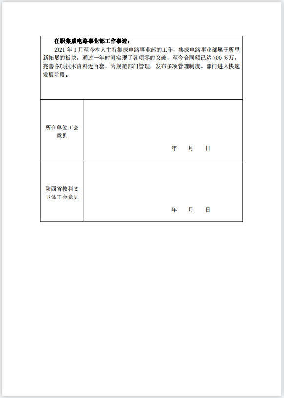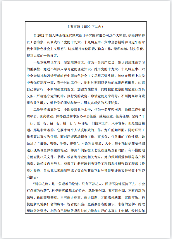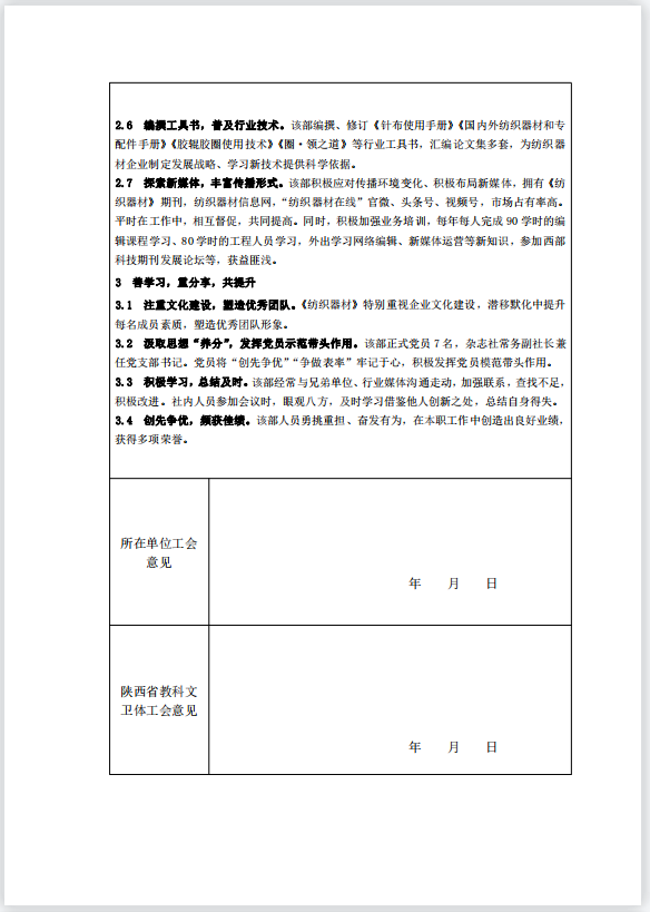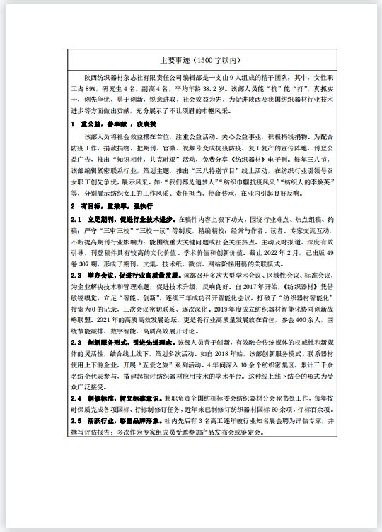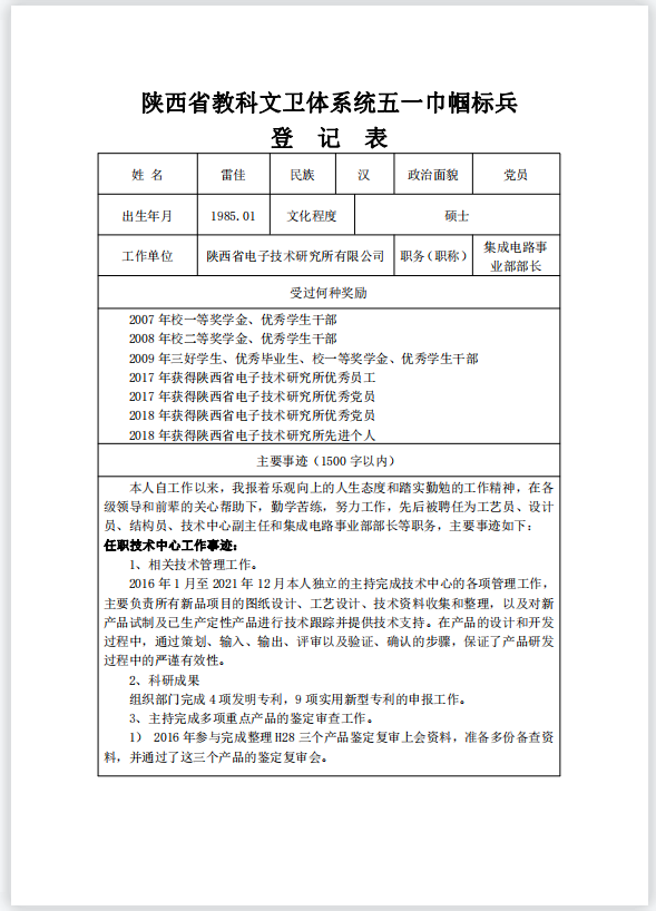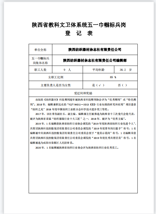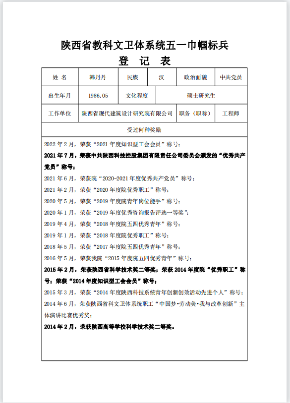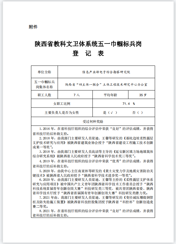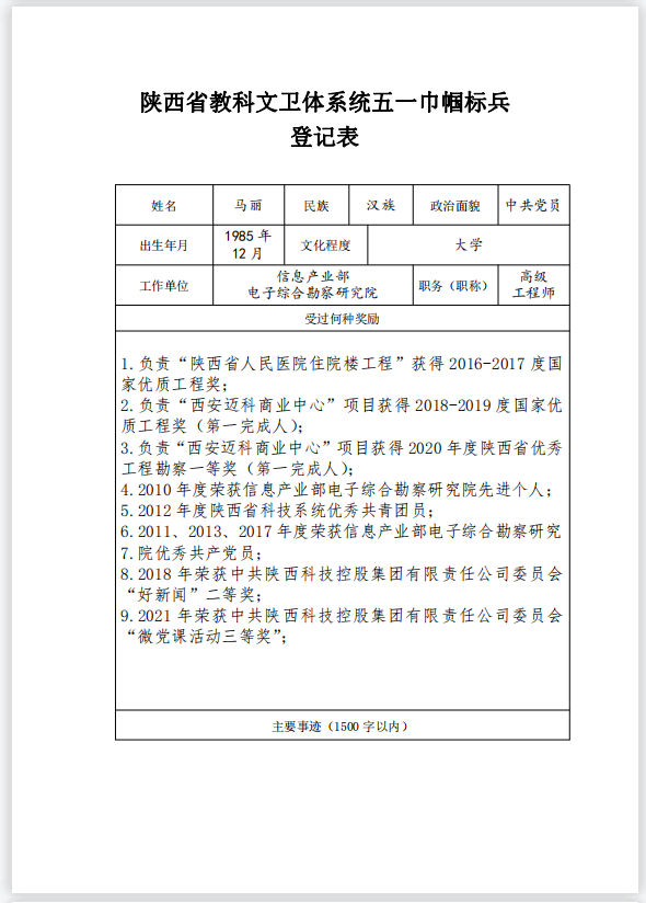 【概要描述】根据陕西省教科文卫体工会委员会《关于推荐评选2022年“陕西省教科文卫体系统五一巾帼标兵(岗)”的通知》,集团公司工会拟推荐信息产业部电子综合勘察研究院的陕西省“四主体一联合”土体工程技术研究中心办公室、陕西纺织器材杂志社有限责任公司编辑部参评陕西省教科文卫体系统五一巾帼标兵岗,推荐信息产业部电子综合勘察研究院马丽同志、陕西省电子技术研究所有限公司雷佳同志、陕西省现代建筑设计研究院有限公司韩丹丹同