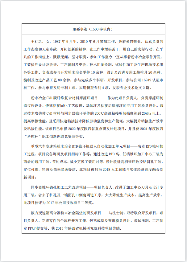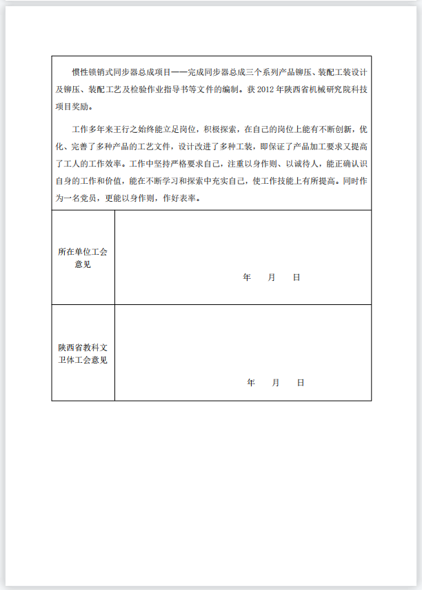 根据陕西省教科文卫体工会委员会《关于推荐评选2022年“陕西省教科文卫体系统五一巾帼标兵(岗)”的通知》,集团公司工会拟递补推荐陕西省机械研究院有限公司王行之同志参评陕西省教科文卫体系统五一巾帼标兵,现将相关材料予以公示。