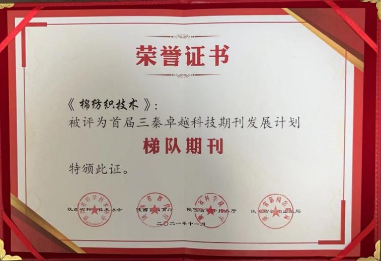 【概要描述】纺科院下属《棉纺织技术》作为三秦卓越科技期刊发展计划梯队期刊