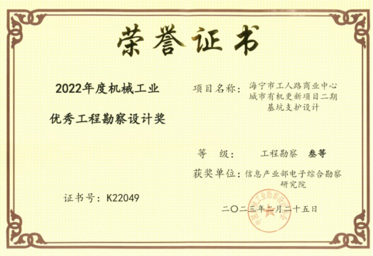 【概要描述】近日,中国机械工业勘察设计协会公布“2022年度机械工业优秀工程勘察设计奖”获奖名单,电勘院共获得工程勘察类奖项2项。“西安万科城7#地商业项目基坑支护设计及监测”获得二等奖,“海宁市工人路商业中心城市有机更新项目二期基坑支护设计”获得三等奖。