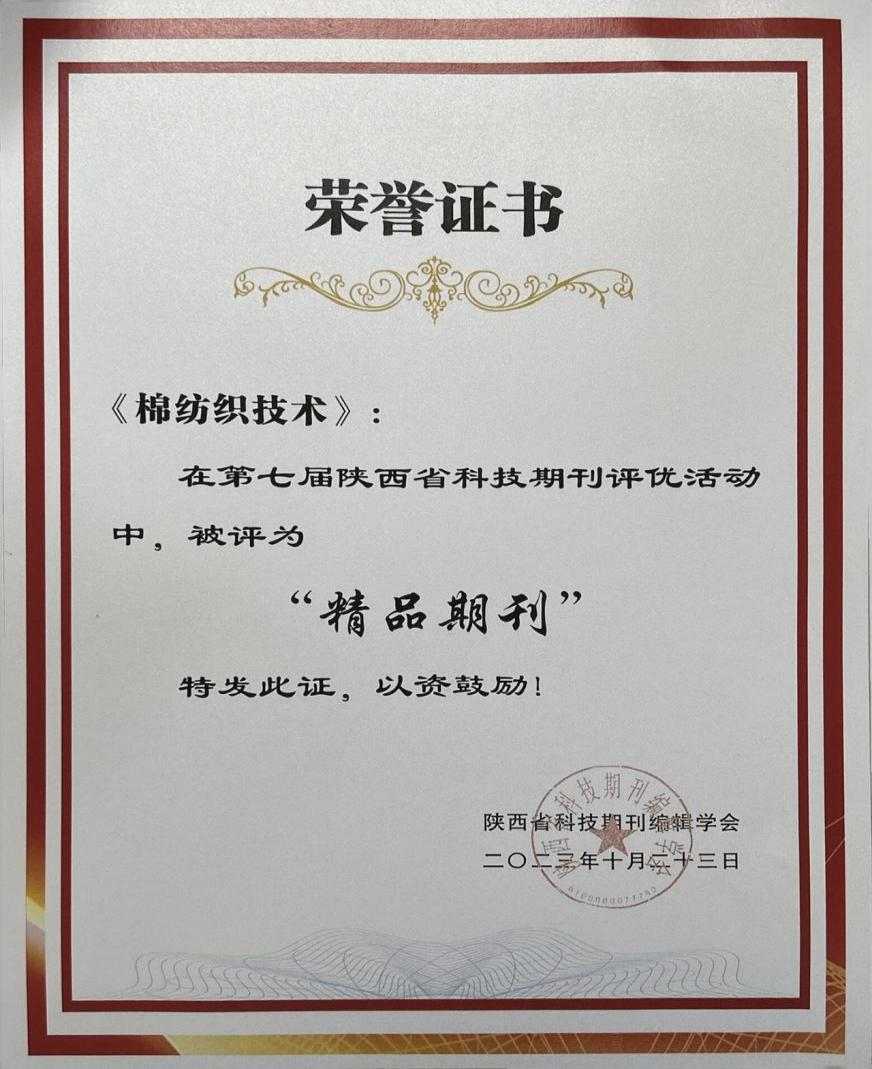 第七届省科技期刊评优活动以《关于深化改革培育世界一流科技期刊的意见》、《关于推进陕西省科技期刊深化改革高质量发展的意见》为导向,以建设三秦卓越期刊、争创世界一流科技期刊为目标,以影响因子等期刊评价数据、数据库收录、行业排名等学术质量为主要定量指标,结合社会效益、出版能力建设等,并经过严格审读、考核编校质量,对期刊进行全面综合考评,评优标准较以往更为严苛。本次共评出精品期刊26种,优秀期刊42家,特色期刊28家,《棉纺织技术》期刊被评为“精品期刊”。此外,期刊3名编辑分别荣获优秀编辑、优秀青年编辑及优秀编务。