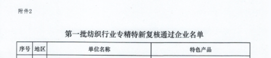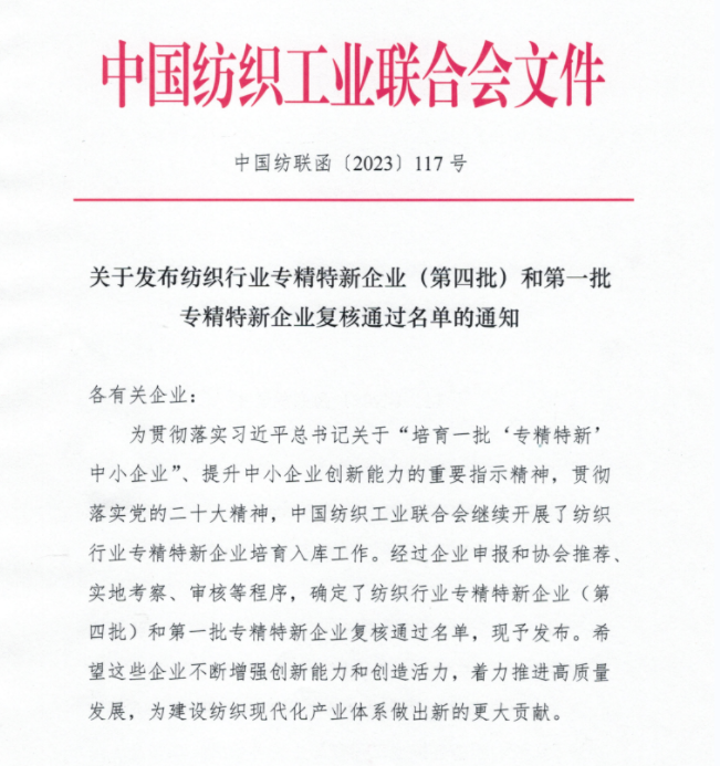 近日,中国纺织工业联合会公布了纺织行业第一批专精特新“小巨人”复核通过企业名单,元丰公司位列其中,这是继今年第二批国家专精特新“小巨人”复核通过之后,公司获得的再次肯定。