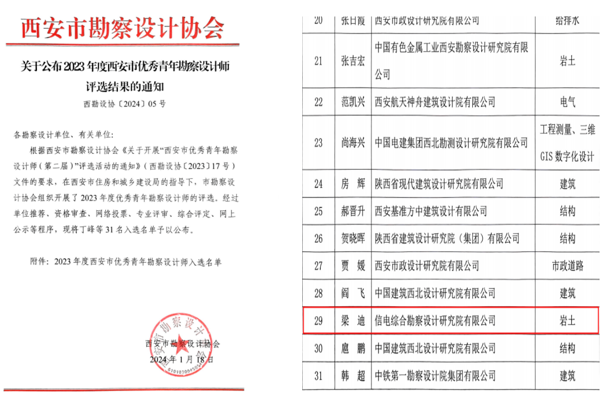 根据西安市勘察设计协会《关于开展“西安市优秀青年勘察设计师(第二届)”评选活动的通知》(西勘设协〔2023〕17号)文件要求,在西安市住房和城乡建设局的指导下,市勘察协会组织开展了2023年度优秀青年勘察设计师的评选,经过资格审查、网络投票、专业评审、综合评定、网上公示等程序,电勘院梁迪同志荣获西安市“优秀青年勘察设计师”称号。
