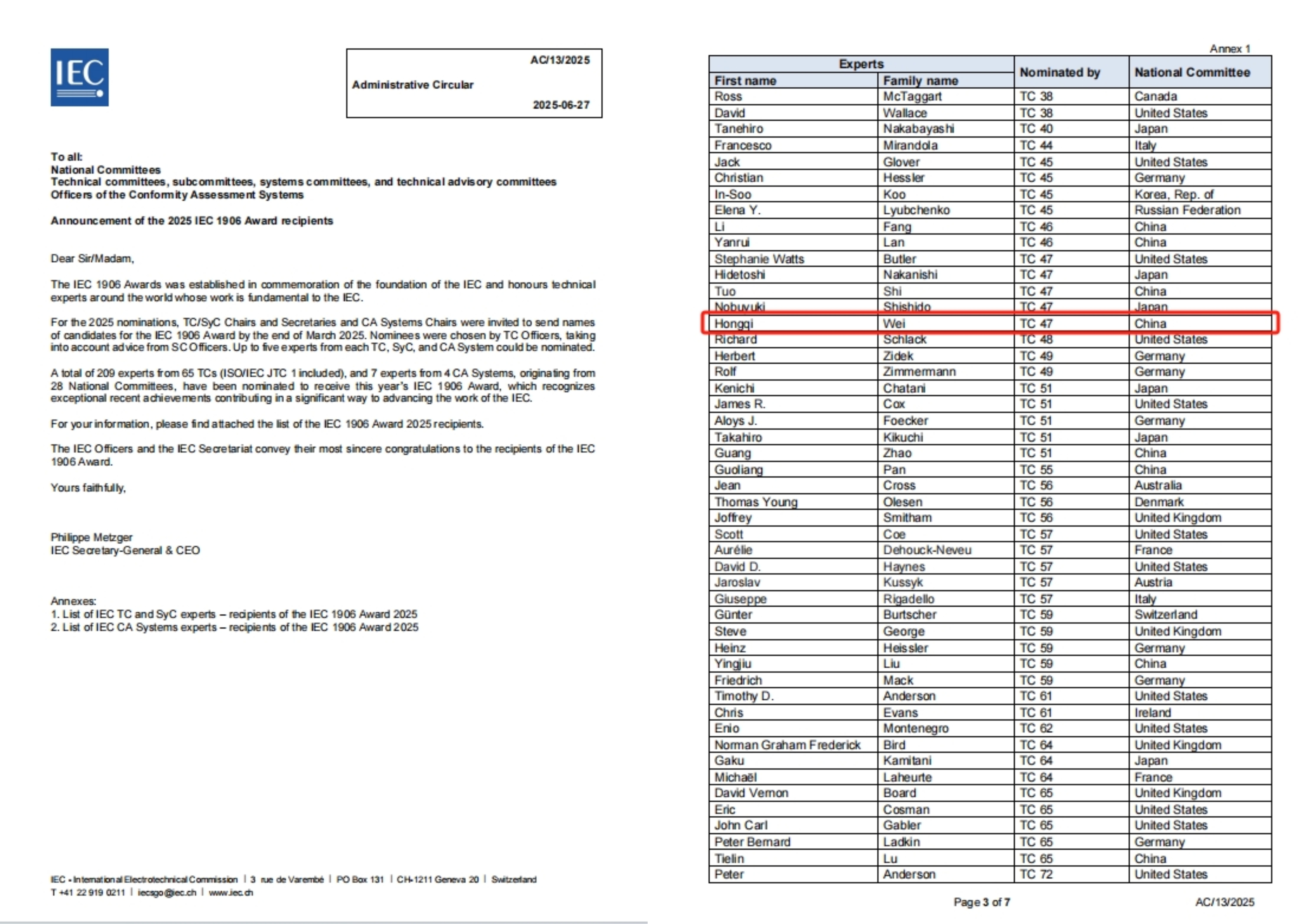 “IEC 1906奖”是IEC最重要的奖项之一,由IEC执行委员会为纪念IEC成立于1906年而设立,旨在表彰全球范围内对IEC国际电工标准化工作做出突出贡献的各国技术专家。